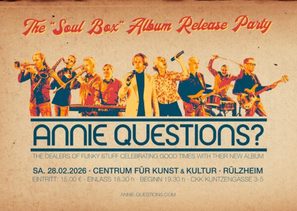 Annie Questions? · Sa., 28. Feb. 2026 · 19.30 h · Centrum für Kunst & Kultur, Rülzheim Das Groove-Collective „Annie Questions?“  um das charismatische Frontduo Dr. Funky P. & Mary verbindet Funk-, Soul- und Jazzsounds und spielt gekonnt mit Einflüssen… Weiterlesen →